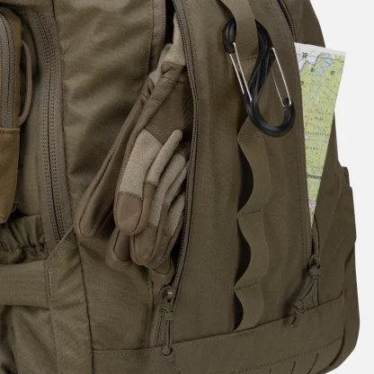 Спереди имеется сетчатый карман на молнии и два небольших наружных кармана на молнии, один из которых на велюровой подкладке для очков. Также имеется большая петля для идентификации или размещения маркера «свой-чужой», два плоских кармана с диагональными молниями и «ромашковая цепочка». Внизу расположена модульная панель для дополнительных карманов, а по бокам имеется трехрядная система MOLLE/PALS с частично эластичными карманами для бутылок или фляг и отверстиями для системы увлажнения.