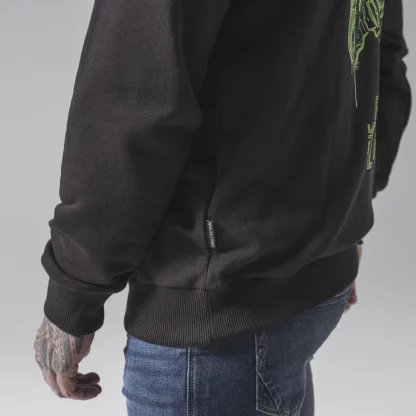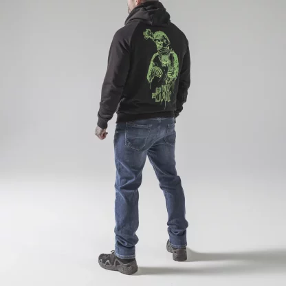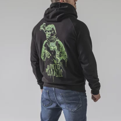 Толстовка со скелетом в стиле милитари на черном фоне.