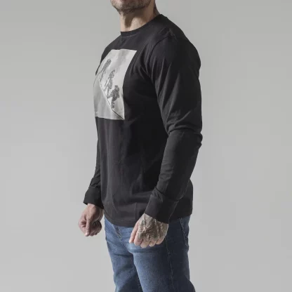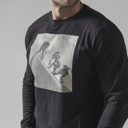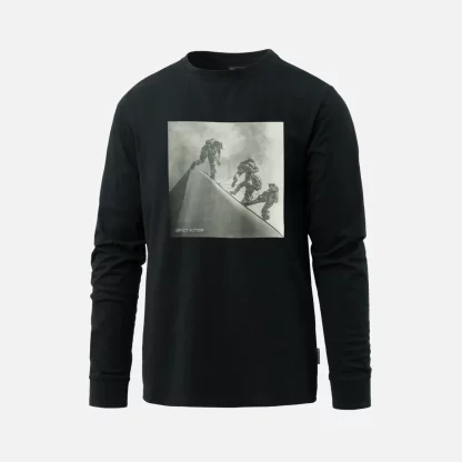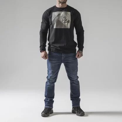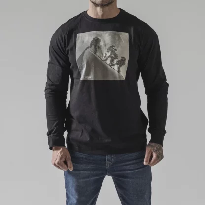 Лонгслив с силуэтами операторов, спускающихся по канатам на стене здания.