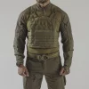 TYPHOON®, новейшее дополнение к нашей линейке нагрудных приспособлений, обладает самой большой поверхностью крепления, сохраняя при этом компактность устройства. Прорези, вырезанные лазером в ламинате, служат интерфейсом для крепления, совместимым с MOLLE/PALS. Благодаря своей конструкции пользователь может использовать только основную панель, добавить дополнительную панель для грудной клетки или с помощью прилагаемого крепежного элемента переносить переднюю баллистическую пластину внутри грудной клетки. Большая монтажная поверхность делает TYPHOON® идеальным выбором для работы на открытом воздухе.