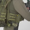 Быстросъемный пояс Guardian Cummerbund — это набор боковых вставок для тактического жилета, которые застегиваются спереди и сзади. В дополнение к боковым вставкам в комплект входит дополнительный ремень с пряжкой, который крепится к одному из ремней безопасности. Как поясной ремень, так и шлейка снабжены быстросъемными пряжками с противоскользящими ручками, что позволяет быстро расстегнуть и сбросить жилет в экстренных ситуациях. Этот комплект также обеспечивает более комфортное надевание жилета, избавляя от необходимости каждый раз отстегивать передний клапан. Поясной ремень в основном изготовлен из структурной сетки, которая обеспечивает дополнительную вентиляцию даже при установленном снаряжении. Поверхность поясного ремня выполнена по модульной системе, совместимой с MOLLE/PALS. Под ремнями модульной системы находится каркасная панель из материала Hypalon, которая стабилизирует переносимое оборудование и обеспечивает достаточную жесткость самой боковой панели.