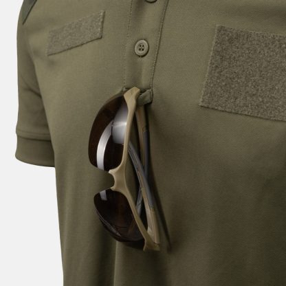 Наша рубашка-поло украшена вставками в стиле лесного камуфляжа на плечах, что делает ее подходящей для полевой формы. Кроме того, рубашка дополнена вставками с застежками-крючками: двумя на рукавах (для национальных знаков различия) и двумя на груди (для нашивок в виде званий и именных жетонов). Планка на пуговицах дополнена практичной петлей для крепления солнцезащитных очков.