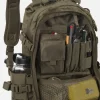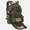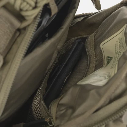 Плечевые ремни и поясной ремень полностью регулируются и могут быть уложены на задней панели, что превращает рюкзак в компактную дорожную сумку, в которой нет незакрепленных частей, за которые можно зацепиться. Передние и боковые панели MOLLE/PALS с лазерной резкой позволяют расширить систему.