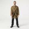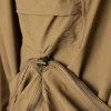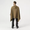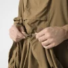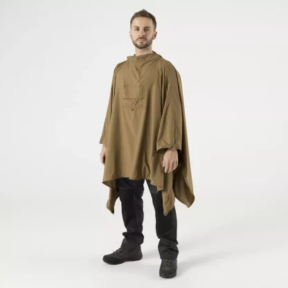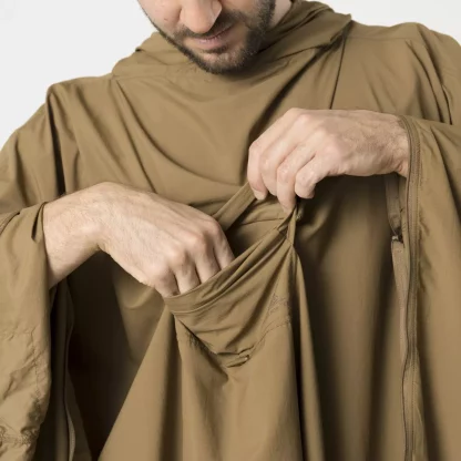 - В разложенном виде оно превращается в пончо с капюшоном, а при застегивании по бокам превращается в легкую куртку. В лагере из него можно сделать импровизированный брезент или сверхлегкий спальный мешок. В сложенном виде он служит мешком для снаряжения.