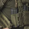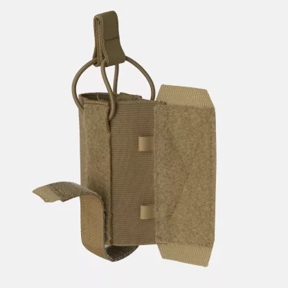 Универсальная сумка представляет собой гибкий держатель для переноски таких предметов, как магазины для винтовки, жгуты, бинты и другие предметы аналогичного размера. Панель может быть прикреплена к различным поверхностям держателя пластины — внутри жилета с помощью крючка и петли, под клапаном или сбоку от него, к застежке кармана пластины или даже к любому поясу с застежкой на крючок и петлю. Чехол может быть ориентирован как на левую, так и на правую сторону; измените направление ремешка внизу. Снаряжение крепится с помощью ударопрочного шнура с нескользящей рукояткой.