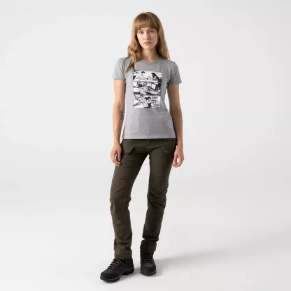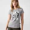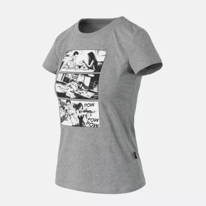 Тонкая женская футболка с изображением тактического комикса. Отличительная форма футболок появилась в начале 20-го века на основе более раннего нижнего белья (известного как униформа). После Второй мировой войны хлопчатобумажные футболки в форме буквы «Т» стали очень популярны, отчасти благодаря Марлону Брандо и Джеймсу Дину, которые носили их на экране.